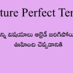 | 10.By the end of the day, she will have been studying for the exam for eight hours. | రోజు ముగిసే సమయానికి, ఆమె ఎనిమిది గంటలుగా పరీక్ష కోసం చదువుతూ ఉన్నట్లు. |