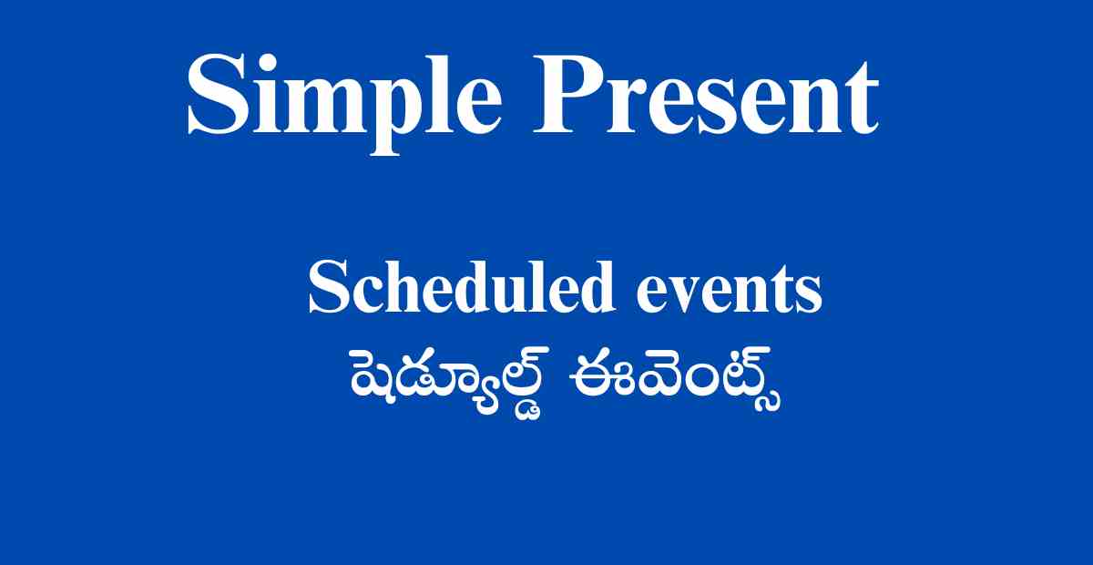 టైం టేబుల్ ప్రకారంగా గాని లేదా షెడ్యూల్ ప్రకారం గా సెట్ చేయబడిన కొన్ని ప్రోగ్రాములు, మరి ముఖ్యంగా ప్రయాణాలు సంబంధించిన విషయాలను చెప్పడానికి ఈ సింపుల్ ప్రెసెంట్ టెన్స్ ను ఉపయోగిస్తారు. ఒకవేళ ఈ కార్యక్రమాలు భవిష్యత్తులో జరుగుతున్నప్పటికీ అవి ముందుగానే సెట్ చేయబడినవి గనుక వాటిని ఈ సింపుల్ ప్రెసెంట్ టెన్స్ లో చెబుతారు.భవిష్యత్తులో జరుగుతున్నాయి గనుక వాటిని ఫ్యూచర్ టెన్స్ లో చెప్పాల్సిన అవసరం లేదు.