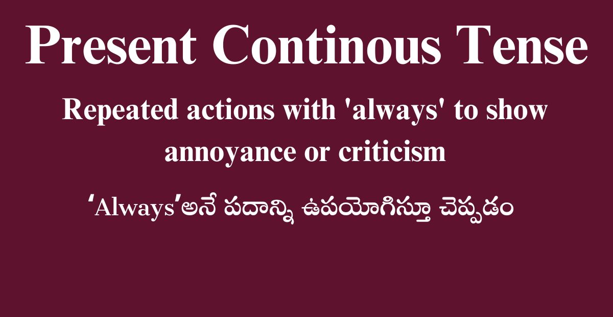 ఎవరైనా ఒక పనిని మరలా మరలా చేస్తున్నప్పుడు, always అనే పదాన్ని ఉపయోగిస్తూ, ఆ వ్యక్తిని విమర్శిస్తూ లేదా కామెంట్ చేస్తూ ఉన్నప్పుడు కూడా Present continuous tense లోనే తెలియజేస్తారు.
