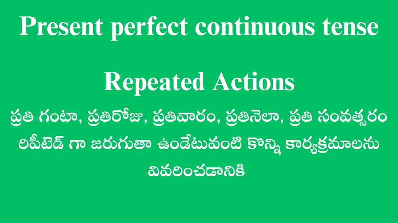 ప్రతి గంటా, ప్రతిరోజు, ప్రతివారం, ప్రతినెలా, ప్రతి సంవత్సరం రిపీటెడ్ గా జరుగుతా ఉండేటువంటి కొన్ని కార్యక్రమాలను కూడా ఈ. Present perfect continuous tense లో తెలియజేయవచ్చు.