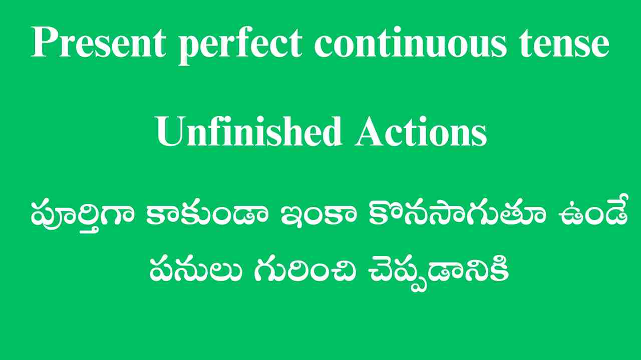 కొన్ని పనులను చేస్తూ ఉన్నప్పటికీ కూడా అవి పూర్తి కావు ఇంకా కొనసాగుతూనే ఉంటాయి, ఇటువంటి సందర్భాలలో కూడా ఈ Present perfect continuous tense ని ఉపయోగిస్తారు. ఈ పాయింట్ కూడా పైన చెప్పిన పాయింట్లు వలె ఉంటుంది పెద్ద తేడా ఉండదు.