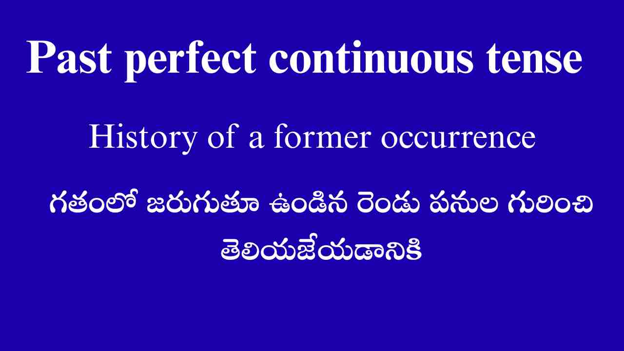 గతంలో జరిగిపోయిన ఒక పని గురించి వివరించడానికి ఆ పని వెనక దానికి అనుబంధంగా కొంతకాలంగా జరుగుతూ వచ్చినటువంటి వాటిని గురించి తెలియజేయడానికి కూడా ఈ Past perfect continuous tense ని ఉపయోగిస్తారు.