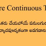 | 5.By the time you get home, I will be preparing dinner. | మీరు ఇంటికి వచ్చే సమయానికి, నేను డిన్నర్ సిద్ధం చేస్తూ ఉంటాను. |