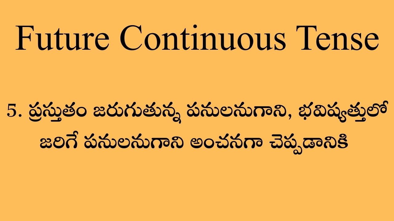 ఈరోజు జరుగుతున్న విషయాలను గాని, భవిష్యత్తులో జరిగే విషయాలను గాని, ఒక అంచనాగా చెప్పేటప్పుడు ఈ Future continuous tense ని ఉపయోగిస్తారు. సాధారణంగా ఈరోజు కంటిన్యూగా జరుగుతున్న పనులను present continuous tense లో చెబుతారు. అయితే ఈ రోజు గాని లేదా రేపు అనగా భవిష్యత్తులో గాని ఏవైనా పనులు జరుగుతూ ఉండవచ్చు అని ఒక అంచనాగా చెప్పేటప్పుడు, ఈ Future continuous tense ఉపయోగిస్తారు.