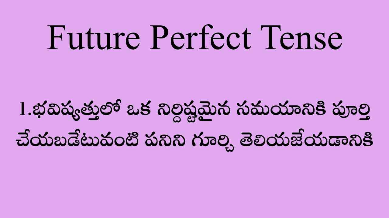 భవిష్యత్తులో ఒక నిర్దిష్టమైన సమయానికి పూర్తి చేయబడేటువంటి పనిని గూర్చి తెలియజేయడానికి Future perfect tense ని ఉపయోగిస్తారు