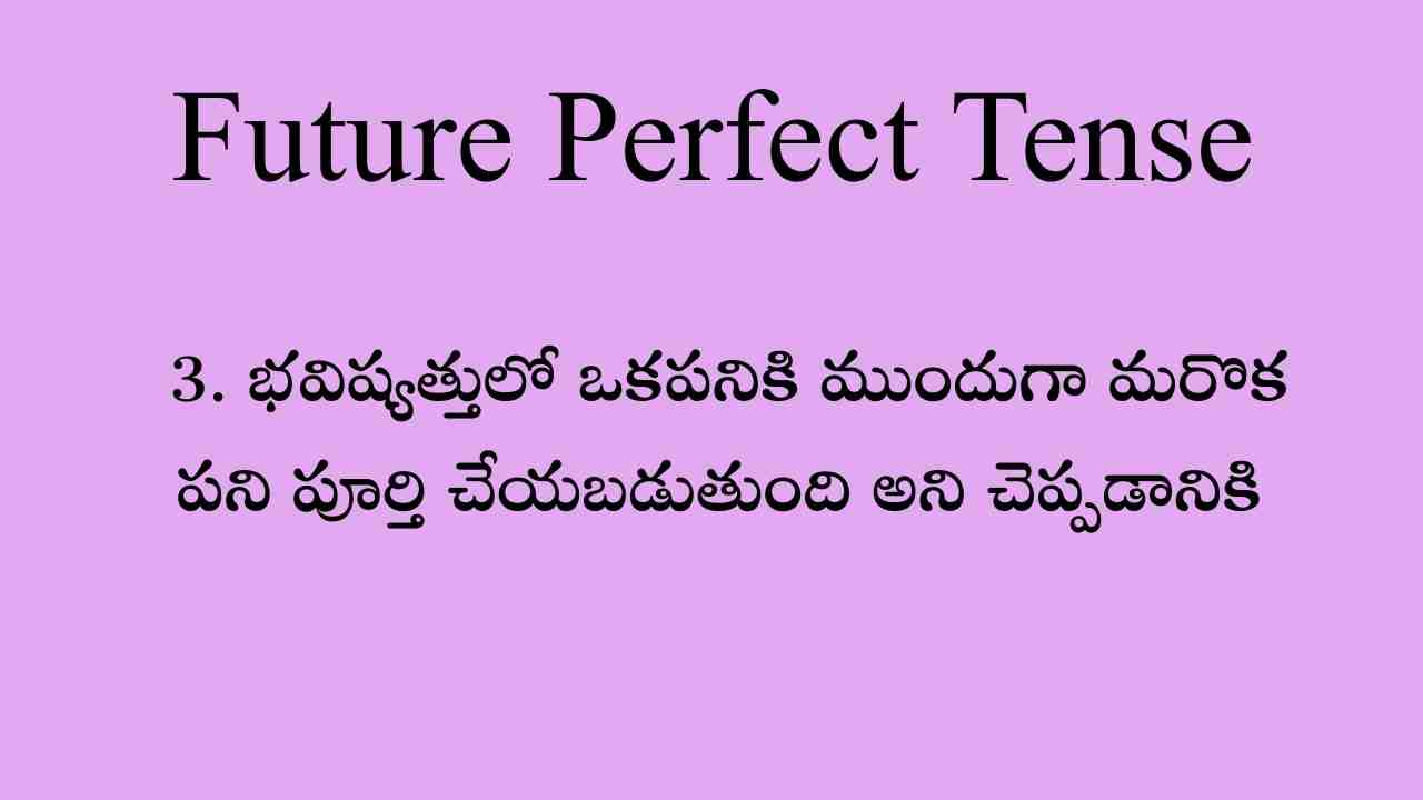 ఇక్కడ రెండు పనులు ప్రస్తుతానికి జరగడం లేదు భవిష్యత్తులో జరుగుతాయి. భవిష్యత్తులో ఒక పనికి ముందుగా మరొక పని పూర్తి చేయబడుతుంది అని చెప్పడానికి కూడా Future perfect tense ఉపయోగిస్తారు. Future perfect tense లో ఒకటి రెండు మూడు పాయింట్లు చూడడానికి ఒకే విధంగా ఉంటాయి.